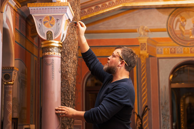 Для кого-то орнаменты на колоннах – это просто графика, но на самом деле это сакральная конструкция со значимым подтекстом: цветок через ромб тянется к солнцу и раскрывается в будущей жизни. Графических, геометрических орнаментов, связанных с солярной темой, темой роста и развития, всегда было много, к примеру, на русских прялках. А я использую такие орнаменты здесь, чтобы породнить помпейский стиль храма и северо-русские мотивы Годеновского креста.Валерий Фёдоров, автор фресок храма святой Елисаветы