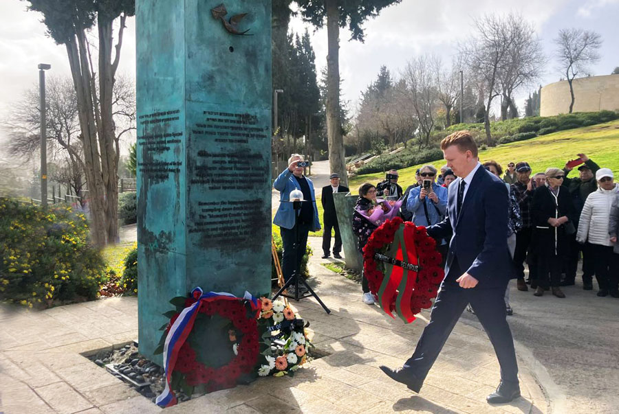 Член Совета Императорского Православного Палестинского Общества в Государстве Израиль Руслан Ашурбейли возложил цветы, представляя Совет ИППО в Израиле, возглавляемый Игорем Рауфовичем Ашурбейли, и Фонд Антонина Капустина, который от имени Совета управляет историческим Сергиевским подворьем в Иерусалиме.