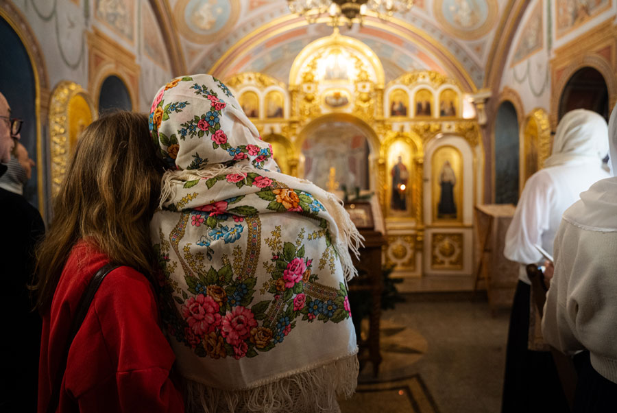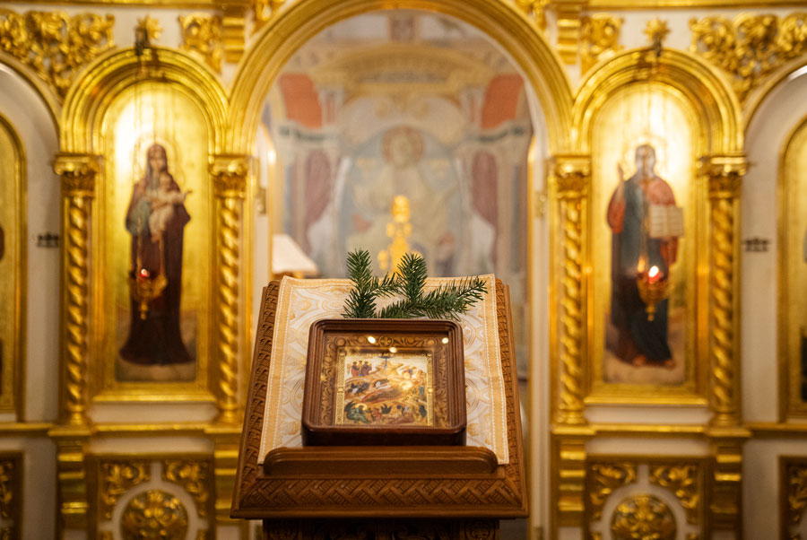 Богослужение длится долго, оно состоит из множества частей, завершаясь Божественной литургией и причастием. В эту ночь ничто не мешает погружению в молитву. Вокруг храма, встречающего прихожан изображением Рождественского вертепа, царит глубокая лесная тишина.