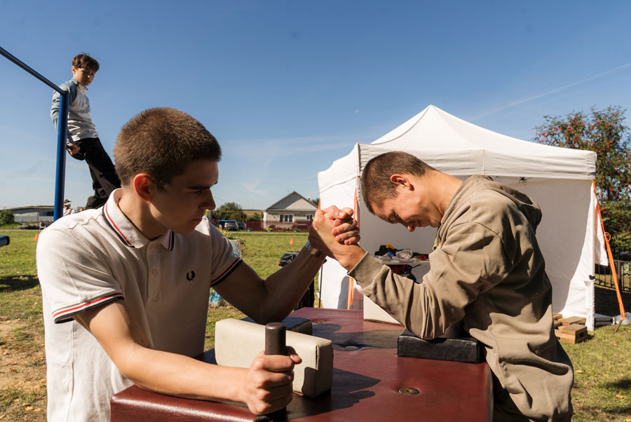 Хочется необычного? Тут любого научат забивать гвозди в доску голыми руками. Не верите? То ли ещё будет! Можно попробовать согнуть сковородку руками или разорвать толстенный бумажный календарь. «Нужна смелость и немного техники», – уверяют Артём с друзьями. Своей заразительной активностью они сумели сплотить всех любителей физкультуры на празднике в единую команду.