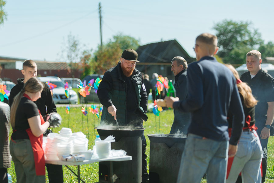 Ресторанными блюдами, приготовленными на живом огне, угощал шеф-повар Иван Кузнецов. В двух казанах для гостей готовилась пшённая каша на наваристом мясном бульоне с томлёными говяжьими щеками. Эти щёки Иван целые сутки томил в печи, чтобы всех угостить на славу.
