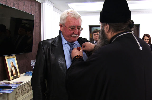 Митрополит вручил Игорю Ашурбейли медаль II степени и поблагодарил его за весомый вклад в поддержку Русской православной церкви и укрепление православных традиций.