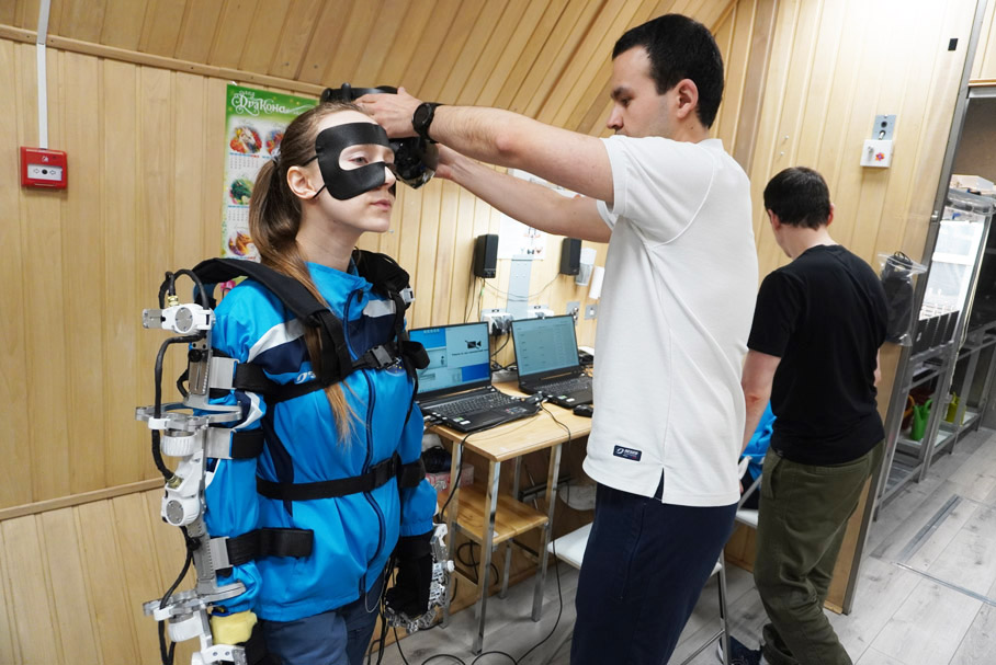 Дополнительно на кожу испытателя клеились электроды, на пояс подвешивался аппарат для мониторинга физиологических показателей. Затем коллеги помогали надеть очки виртуальной реальности и соединяли все устройства «костюма» с двумя компьютерами. Испытатель таким образом «вселялся» в виртуальное пространство и выполнял команды операторов.