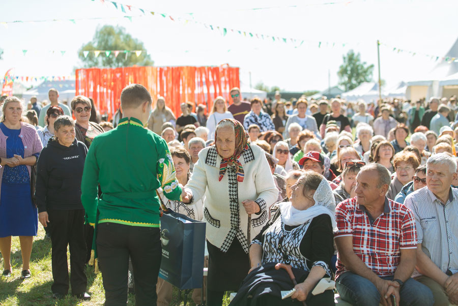 И самое главное – со сцены почтили жителей села, отметили юбиляров и семьи подарками. Подарки были замечательные: текстиль всегда пригодится, качество отличное, и по размеру всё подошло. Отдельная радость для наших бабушек – мягкий зефир и хороший чай. Чувствуется, что собирали подарки с заботой.