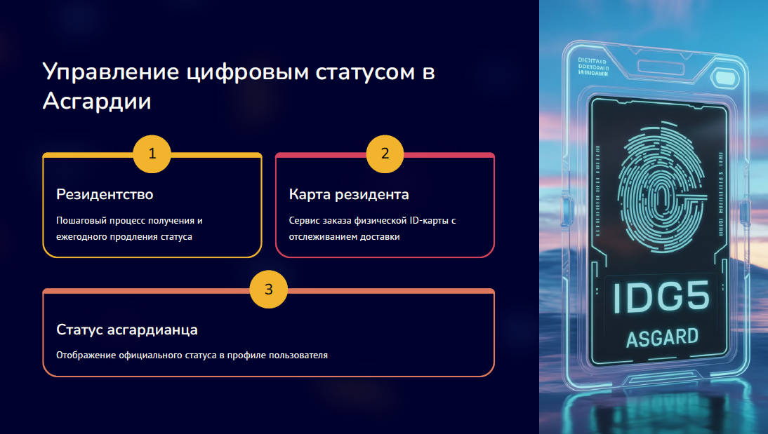 Через приложение можно оформить и ежегодно продлевать резидентство в Асгардии, заказать ID-карту и подтвердить в профиле свой официальный статус.