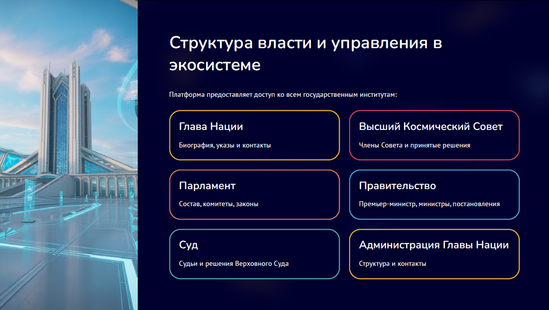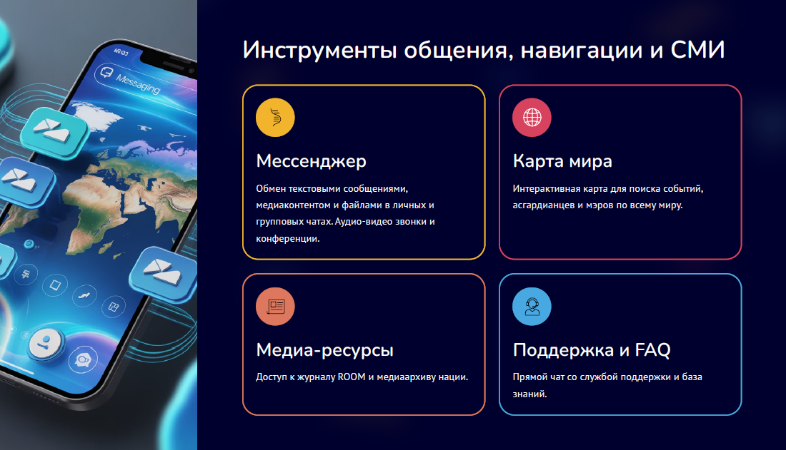 Платформа открывает доступ к основам государственности и национальным символам Асгардии, а встроенная презентация знакомит пользователей с её историей, философией и миссией.