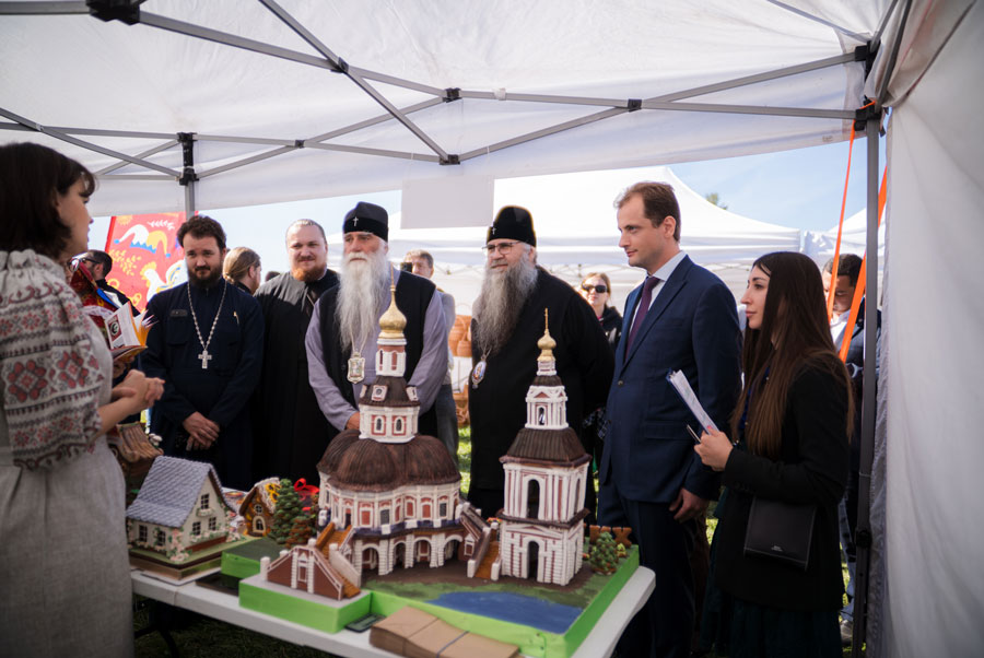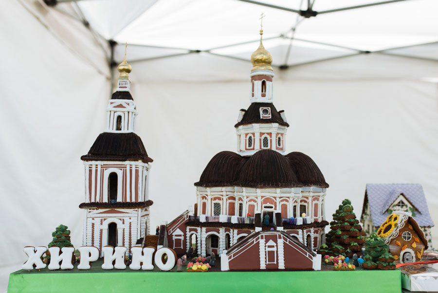 Татьяна Догадина («Карамельная сказка», г. Балахна) представила на конкурс невероятной красоты пряничный храм – практически точную копию Хиринского храма – символа фестиваля «Голос традиций», того самого храма, с восстановления которого Акционером Холдинга «СОЦИУМ» Игорем Ашурбейли началось возрождение села.