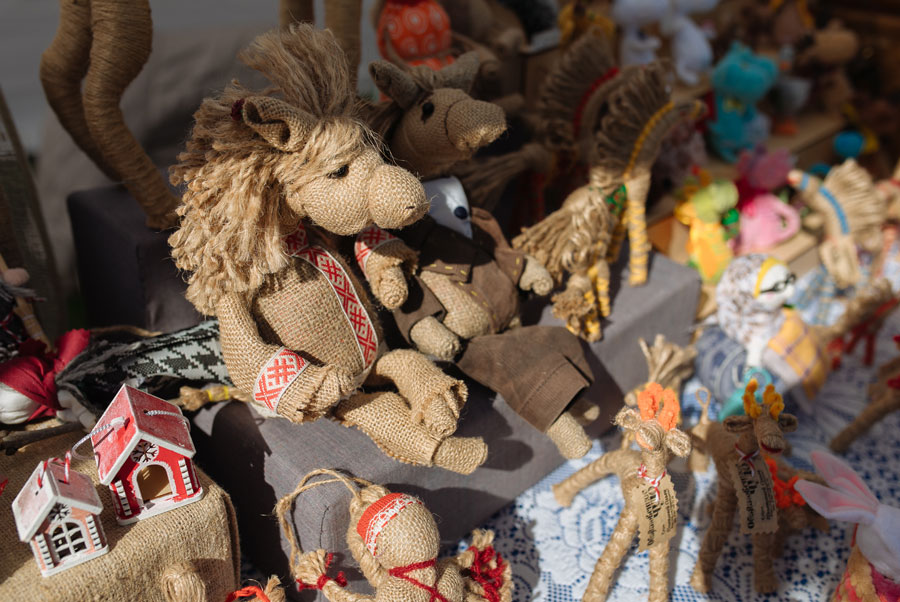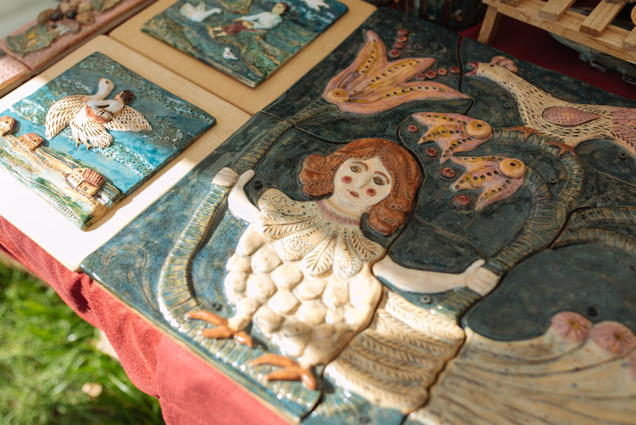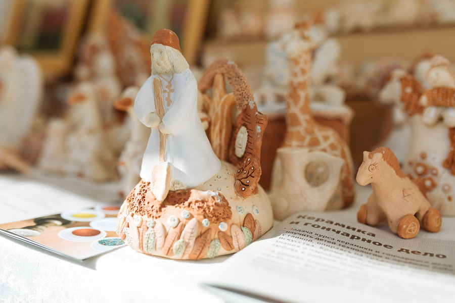 Сувениры, витражи и мозаика авторства мастерской Макаровых основаны на Нижегородских символах. Деревянная луковка уже не просто украшение интерьера, а практичный канцелярский набор. А матрёшка в форме гуся – пожалуй, одна из самых необычных малых сувенирных форм на ярмарке.